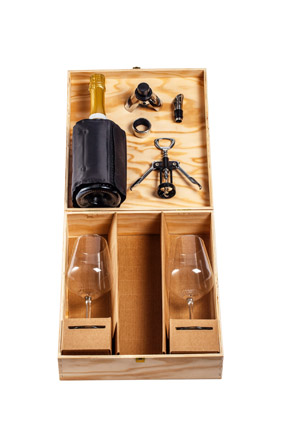 Art. 3221 28x34x9h – Cassetta per 1 bottiglia spumante con due calici da 55 cl + fascia refrigerante + cavatappi + versatore + tappo salvavino + salvagoccia con imballo esterno